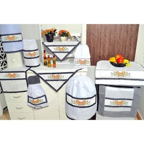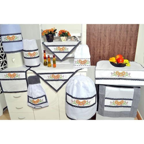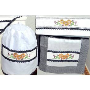 Jogo fabricado em tecido tergal na cor branco, kit com 10 peças, com barrado bordado em ponto cruz de girassol, nas cores marrom, amarelo, preto, laranja, branco e verde, com detalhes em tecido preto xadrez, acabamento em laise e viés na cor xadrez e bolinha preto.