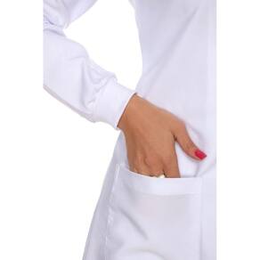 Jaleco feminino ACINTURADO manga longa é confeccionado em Microsarja, tecido 100% poliéster.