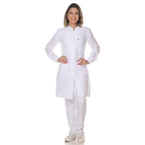 Jaleco feminino ACINTURADO manga longa é confeccionado em Microsarja, tecido 100% poliéster.