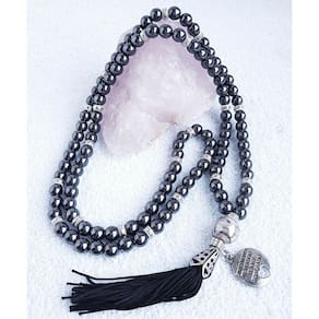 sempre em sintonia com as melhores vibrações, as criações da encanto das contas são produzidas dentro de cuidadosas normas de qualidade. Desde a busca das melhores pedras até a pubicação de nossas coleções, todo o processo de confecção dos japamalas é feito pensando em encantar e atingir a satisfação plena de quem as recebe, fazendo parte dos momentos de meditação, conexão, elevação e autocuidado. Japamala 108 contas em pedras naturais hematita e pingente ho'oponopono