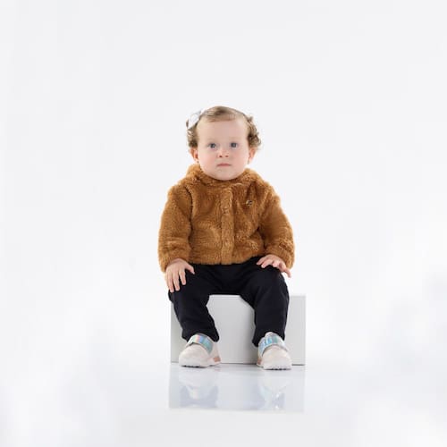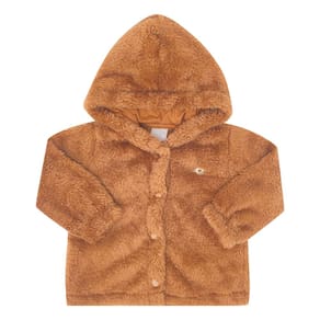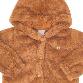 Casaco com peluciado com capuz conquista todas as fashionistas inclusive as babys. Confeccionado em tecido meia malha na cor castor e o detalhe da placa de metal na frente da peça trás um charme para o look. Fofinho e super estiloso para ir visitar a vovó e dar aquele abraço quentinho de ursinha nela! \n