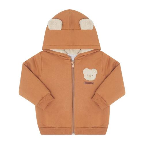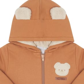 Jaquetas são versáteis, quentinhoe confortáveis para os babys curtirem o dia com a vovó sem se preocuparem com o frio.Confeccionado em moletom, a jaqueta na cor castor possuí pelo carneirinho na parte interna, deixando o dia e o look do seu baby ainda mais fofo e confortável. O capuz possuí orelinhas fofas de ursinho e a parte da frente da peça possuí etiqueta termocolante de urso ao lado esquerdo de quem veste. Assim fica impossível não querer apertar esse ursinho!\n