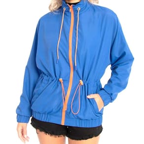 Jaqueta feminina confeccionada em tecido poliéster na cor royal com zíper laranja.