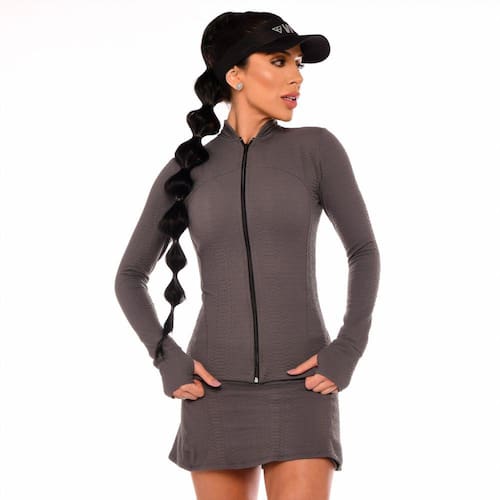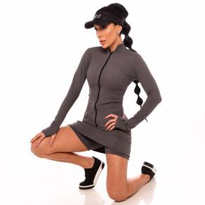 Seu tecido possui compressão, elasticidade, respirabilidade, proteção UV50+ e conforto térmico, que ajudam na performance esportiva. Já suas cores, são totalmente neutras Off-white e cinza escuro.