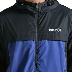 Jaqueta Hurley Windbreaker, forro em mesh, capuz com gola alta, heat transfer ONE&ONLY refletivo, recorte frente e costas e bolsos frontais selados.