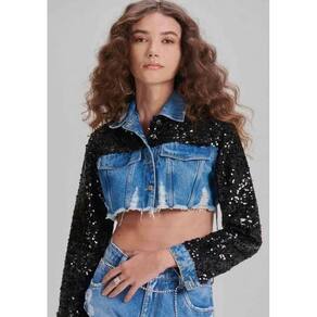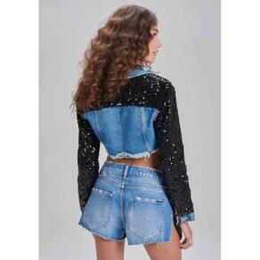 A jaqueta cropped mistura a versatilidade do jeans com a elegância dos paetês. A barra desfiada, os bolsos e as mangas longas complementam o estilo, perfeito para usar em ocasiões de festas, casuais ou elegantes.