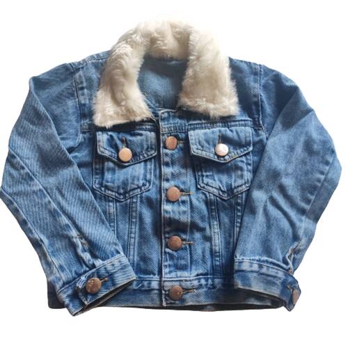 Jaqueta jeans feminina infantil com pelo sintético, fechamento em botões, bolsos na frente, podendo ser com ou sem bordados, dependendo do modelo, de acordo com as fotografias.