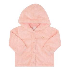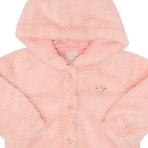 Casaco com peluciado com capuz conquista todas as fashionistas inclusive as babys. Confeccionado em tecido meia malha na cor rosê e o detalhe da placa de metal na frente da peça trás um charme para o look. Fofinho e super estiloso para ir visitar a vovó e dar aquele abraço quentinho de ursinha nela! \n