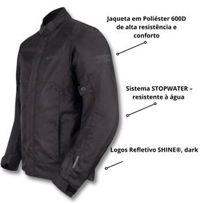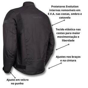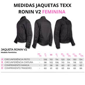 DESCRIÇÃO TECNICA JAQUETA TEXX RONIN LADY V2: • Jaqueta em Poliéster 600D de alta resistência e conforto; • Modelagem feminina; • Sistema STOPWATER – resistente à água; • Logos Refletivo SHINE, dark; • Protetores Evolution internos removíveis em E.V.A. nas costas, ombro e cotovelo; • Leve e de altíssima resistência e abrasão; • Tecido elástico nas costas para maior movimentação e liberdade; • Design moderno e caimento perfeito no corpo; • Botões personalizados; • Canaleta interna central para bloquear a entrada de água; • Ajustes nos braços e na cintura; • Ajuste no punho;
