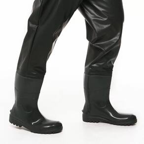 Jardineira em PVC emborrachado 100% impermeável com bota acoplada, bolso interno, cordão de ajuste no peito e suspensório em elástico ajustável com sistema de engate rápido.