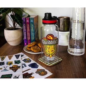 - De volta à Hogwarts: esteja você em campo ou nas arquibancadas, esta garrafa de água garante que você esteja pronto para a partida. Apresenta a palavra Quadribol ao lado do brasão dourado de Hogwarts. E há até um pomo dourado voando por aí.