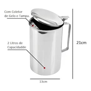 fabricada em aço inox de alta qualidade, com design fino e elegante. Suas bebidas sempre na temperatura ideal, com sabor e aroma preservados. Por ser feita em aço inox, a jarra mantém as características das suas bebidas. O material não é poroso e, por isso, não absorve odores nem sabores e não deixa a sua água com gosto. Além disso, o material é resistente e fácil de limpar. A tampa impede a contaminação dos líquidos e o aparador de gelo facilita o ato de servir. Boas compras