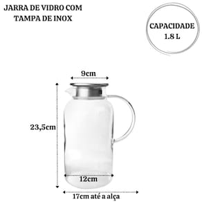 Informações Técnicas: Composição: Vidro e tampa de inox Capacidade: 1,8 litros Dimensões: Altura: 23,5 cm Diâmetro da base: 12 cm Diâmetro da tampa: 9 cm Peso: 476 g Validade: Indeterminada