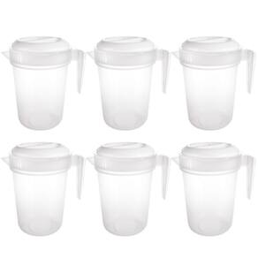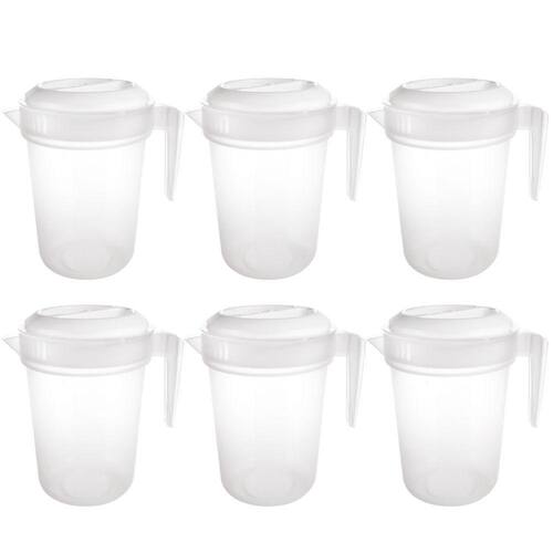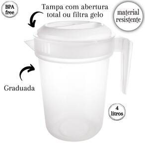 Conjunto com 6 jarras. Jarra plástica reforçada com capacidade para 4 litros. Possui tampa e graduação para medida. Sua tampa tem duas formas de abertura: de um lado o fluxo de líquido é contínuo e o outro possui coador para gelo e pedaços de fruta. É produzida em material atóxico, livre de BPA e pode ser usada no freezer e no microondas.Material: polipropilenoCapacidade: 4 litrosComprimento: 23,8 cm / Largura: 19,4 cm / Altura: 28,2 cm