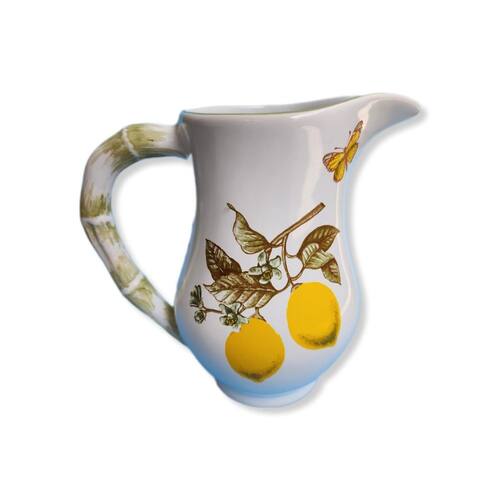 Jarra em Cerâmica com estampa de limão e borboleta, indicada para servir água ou suco e serve também para decorar com estilo sua mesa. Nova coleção, chamada de Limoncello, traz muita alegria e frescor no dia a dia, com seus limões e borboletas e alça pintada à mão. Material: Peças em Cerâmica faiança, artesanal de fabricação nacional, não refratária, produzida de acordo com as tradições da Indústria ceramista de Alcobaça / Portugal. Obs: Peças podem conter variações de cores por ser um produto artesanal. Tamanho: 13x13x16 Marca: Não Informado