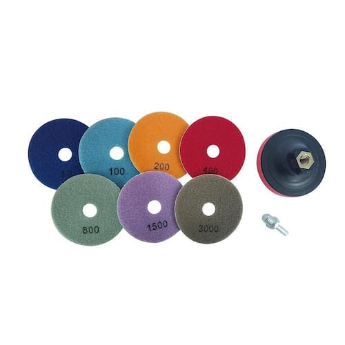 Jogo com 7 Lixas Diamantadas para desbaste e polimento de mármore, granito, porcelanato, etc. Também conhecida por Lixa d'água, lixa de cerâmica, entre outros. Produzida em resina e diamante sintético, para uso a seco ou refrigerado a água mais indicado , máximo RPM 4.000, apoio com Pluma que facilita o manuseio e rápida substituição. O jogo compõe 7 lixas com medidas de 100mm e grãos de 50, 100, 200, 400, 800, 1500 e 3000, um suporte de lixa com sistema de fixação Pluma de 100mm e um adaptador suporte de disco lixa. Ideal para marmorarias, indústrias de porcelanato, e outros. Cabo Extensível para Desempenadeira. Atributos do produto: Tipo: Lixa Diamantada Peso líquido:g Peso total embalagem:g Marca: Lotus Composição: EAN:7908027211085 Conteúdo da embalagem: Jogo com 7 Lixas Diamantadas Garantia: Exclusiva de 12 meses Importante: Produtos de decoração não inclusos. Imagens meramente ilustrativas.