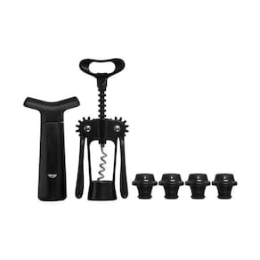 Esse jogo conta com 6 peças que irão facilitar desde a abertura da garrafa com segurança até a conservação do vinho já aberto.