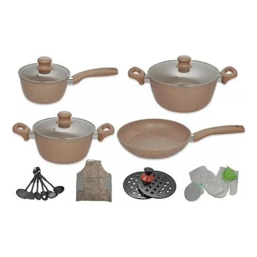 Jg de panela quartzo stone marrom gold antiaderente Melhore a sua cozinha com a coleção dsseldorf quartzo stone creme com qualidade , projetada para um ótimo desempenho de cozimento em casa. Conteúdo: 18 peças As tampas são contadas como peças. Conjunto de panelas: 1 caçarola 20cm 1 caçarola 16cm 1 frigideira 20cm 1 panela 28cm Utensílios: 6 utensílios de cozinha em silicone preto 1 avental 2 luvas 1 pegador 1 bucha 2 botões de sucção 2 suportes para panelas. : 90 dias.