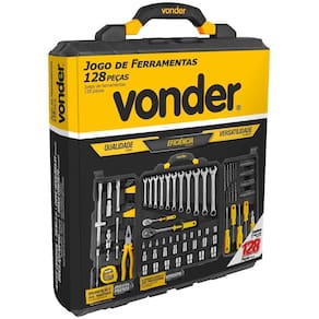 1 Jogo de ferramentas, composto por 128 peças, sendo: 1 maleta plástica, 1 porta-chaves allen/hexagonais, 1 porta-chaves hexalobulares, 4 porta-bits, 1 alicate universal 8" isolação 1000V em aço cromo vanádio, 8 chaves hexalobulares em aço cromo vanádio (T9, T10, T15, T20, T25, T27, T30, T40), 1 trena 5 m, 2 chaves de fenda em aço cromo vanádio (5,0 mm x 75 mm (3/16" x 3") e 6,3 mm x 100 mm (1/4" x 4")), 2 chaves phillips em aço cromo vanádio (5,0 mm x 75 mm (n1 - 3/16" x 3") e 6,3 mm x 100 mm (n2 - 1/4" x 4")), 8 chaves allen/hexagonais em aço cromo vanádio (1,5 mm, 2 mm, 2,5 mm, 3 mm, 4 mm, 5 mm, 5,5 mm e 6 mm), 11 chaves combinadas em aço cromo vanádio com acabamento cromado (8 mm, 9 mm, 10 mm, 11 mm, 12 mm, 13 mm, 14 mm, 15 mm, 17 mm, 18 mm e 19 mm), 15 soquetes sextavados encaixe 1/2" em aço cromo vanádio (10 mm, 11 mm, 12 mm, 13 mm, 14 mm, 15 mm, 17 mm, 18 mm, 19 mm, 20 mm, 21 mm, 22 mm, 23 mm, 24 mm e 27 mm), 1 catraca encaixe 1/2" em aço ao cromo, 1 extensão 5" em aço cromo vanádio encaixe 1/2", 1 junta universal em aço cromo vanádio encaixe 1/2", 1 cabo T em aço cromo vanádio encaixe 1/2" x 10", 2 soquetes para vela de ignição em aço cromo vanádio (16 mm e 21 mm), 11 soquetes sextavados em aço cromo vanádio encaixe 1/4" (4 mm, 5 mm, 6 mm, 7 mm, 8 mm, 9 mm, 10 mm, 11 mm, 12 mm, 13 mm e 14 mm), 1 catraca encaixe 1/4" em aço ao Cromo, 1 extensão em aço cromo vanádio 2" encaixe 1/4", 1 extensão em aço cromo vanádio 4" encaixe 1/4", 1 extensão flexível 6" em aço cromo vanádio encaixe 1/4", 1 junta universal em aço cromo vanádio encaixe 1/4", 1 cabo adaptador para bits com catraca encaixe 1/4", bits magnéticos em aço cromo vanádio encaixe 1/4": 7 fenda (3,5 mm (2 peças), 4 mm (2 peças), 5,5 mm, 6,5 mm e 8 mm), 8 phillips (N 0, N 1, N 2 e N 3 (2 peças cada)), 6 allen (2 mm, 3 mm, 4 mm, 5 mm, 6 mm e 7 mm), 3 quadrados (S1, S2 e S3), 7 hexalobular (T10, T15, T20, T25, T27, T30 e T40), 3 pozidrive (PZ1, PZ2 e PZ3), 4 três pontas (1, 2, 3 e 4), 2 adaptadores, 5 brocas HSS (3 mm, 3,5 mm, 4 mm, 5 mm e 6 mm) e 5 brocas para concreto (3 mm, 4 mm, 5 mm , 6 mm e 8 mm).