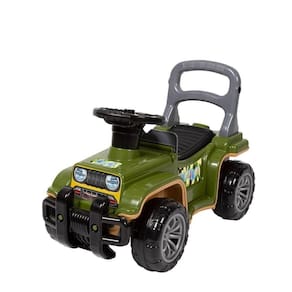 Jipe Carrinho Passeio Quadriciclo Empurrador Verde Militar Jip Jip Carrinho Passeio Com Empurrador Verde Militar ============================================================ Versão na cor verde musgo com adesivos camuflados. Para passear, o adulto tem controle na direção do carrinho, as rodas dianteiras viram para os lados.