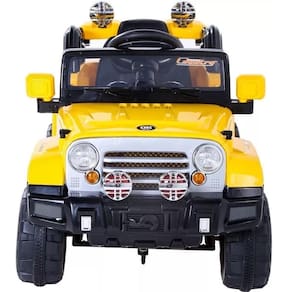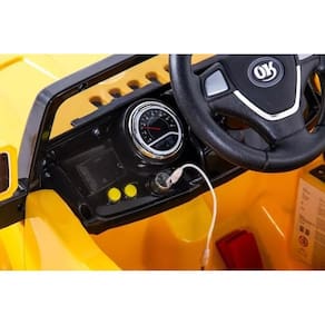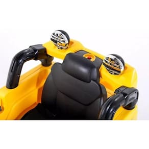 Direção com 2 botões 1 para buzina e outro tocar música infantil Entrada para ipod / Mp3 Acende luz do farol Acende luz do suporte traseiro - funciona com 3 pilhas AA Não Incluidas As portas abrem Botão de Liga/Desliga Botão de seleção para escolha de uso pelo controle ou pela criança Pode ser controlado pela criança ou por um adulto através do controle remoto Pedal para que a criança possa acelerar Cinto de segurança para prender a criança Especificações: