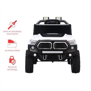 Com um visual inspirado em jipes 4x4, este veículo infantil conta com detalhes imponentes como faróis de led, para-choque robusto e pintura estilizada. Um brinquedo que chama atenção pela aparência e acabamento.