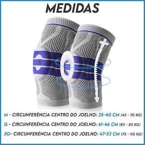 Para tomar sua medida, estique a perna e pegue a circunferência do seu joelho na altura da patela centro do joelho , compare com o guia acima. - compressão na medida certa com seu revolucionário tecido 3d spandex de alta qualidade - anel de silicone patelar com efeito massageador, proteção e absorção de impactos - espiral flexivel nas laterais - estabilidade para movimentos giratórios