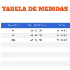 M - circunferência de patela: 35 - 40 cm G - circunferência de patela: 40 - 45 cm GG - circunferência de patela acima de 46cm