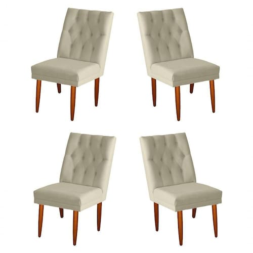 Ela é fabricada em madeira de eucalipto refrorestavel,com tecido suede com pés palitos super reforçada . e com um lindo detalhe em seu encosto com um lindo trabalho de capitonê artesanal,e botão encapados. essa cadeira sem sombra de duvidas além de ser linda é super confortavel.