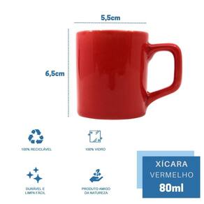 Conjunto de Xícaras de 80ml Com um acabamento em alto brilho e um design moderno, essa xícara é uma excelente escolha para quem quer dar um toque de elegância à sua cozinha ou sala de estar. A cor vibrante e marcante do vermelho dá um destaque especial à peça, tornando-a ainda mais atraente. Se você é um amante de café e quer ter uma xícara de qualidade para saborear sua bebida preferida, essa opção de 80ml na cor vermelha é uma excelente escolha