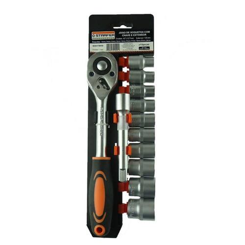 - Jogo 10 Peças Soquete com encaixes de: 10mm, 11mm, 12mm, 13mm, 14mm, 15mm, 17mm, 19mm, 22mm e 24mm.