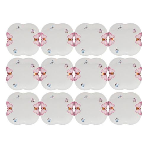 Jogo 12 Prato de Sobremesa Borboletas 19cm Porcelana Branco Wolff