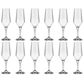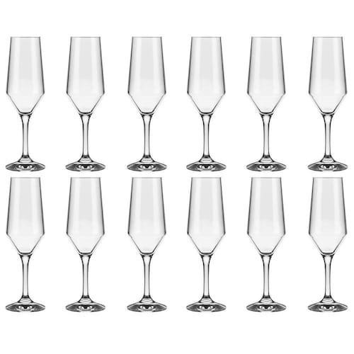 Garantia: 90 dias / Peso: 2,52kg / Cor predominante: transparente / Referência: 7891155062776X2 Dimensões de cada taça: 6,2cm (D) x 20cm (A); Capacidade de cada taça: 186ml; Conteúdo: 12 taças; Indicado para: champanhe e espumante; Material: vidro.