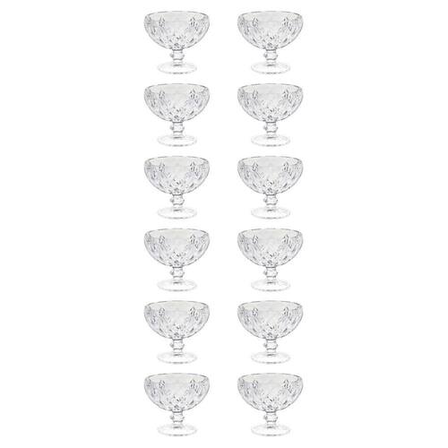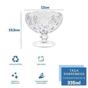 Taça de Sobremesa de 335ml Diamante Com sua capacidade de 335ml, essas taças são ideais para servir porções generosas de sobremesas como sorvetes, mousses, pudins e outras delícias. Além disso, por serem transparentes, permitem que você aprecie a beleza das camadas e texturas de suas sobremesas, tornando a experiência de saboreá-las ainda mais agradável. Estas taças são fáceis de limpar e podem ser utilizadas em diversas ocasiões, proporcionando um toque especial e elegante à sua mesa.