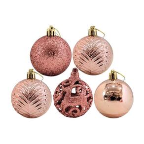 Jogo 18 Bolas de Natal Rosê Metalizado – Textura Folha Palmeira e Glitter Vazado 6cm