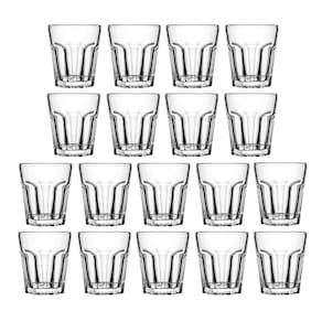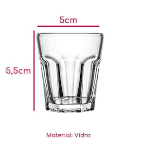 é um copo coringa, utilizado para pequenas doses de drinks com rum, tequila ou vodka, muito utilizado em festas e eventos para servir bebidas. Características: - altura: 5,5cm - diâmetro: 5cm - material: vidro - capacidade: 45ml - cor: transparente - conteúdo: 18 copos