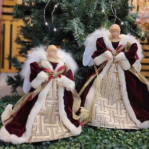 Design Luxuoso: O anjo veste uma roupa de veludo nas cores vinho e dourado, cuidadosamente decorada para refletir a riqueza e a beleza da temporada natalina.