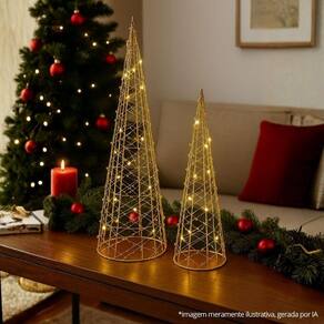 O kit inclui 2 árvores iluminadas em tamanhos diferentes (50cm e 40cm), confeccionadas em estrutura metálica aramada no formato de cone e decoradas com miçangas douradas e mini bolinhas cristal, que refletem a luz e criam um efeito luminoso sofisticado. Cada árvore possui fio LED branco quente, alimentado por pilhas, garantindo iluminação suave e acolhedora perfeita para decorar salas, mesas, aparadores ou vitrines.