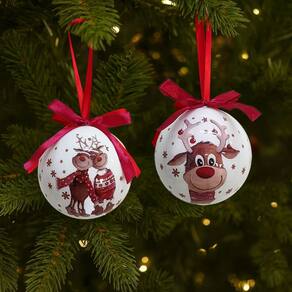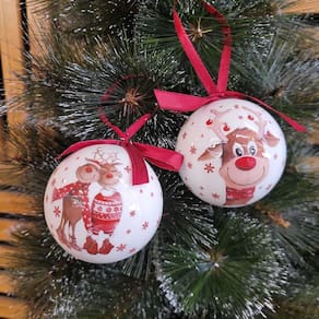 Deixe sua árvore ainda mais encantadora com este conjunto de 4 bolas natalinas decoradas, no modelo laqueado branco com estampa premium de casal de renas e rena feliz. Cada bola vem finalizada com laço vermelho e fita para pendurar, proporcionando charme e praticidade na montagem da sua decoração.