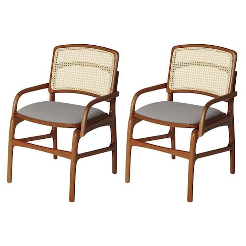 AS IMAGENS SÃO MERAMENTE ILUSTRATIVAS E PODEM SOFRER VARIAÇÕES DE COR E PEQUENOS DETALHES DE ACORDO COM O SEU MONITOR, ILUMINAÇÃO DO AMBIENTE E ATÉ MESMO A SUA PERCEPÇÃO VISUAL.Jogo 2 Cadeiras de Jantar FlorenÃa Estrutura em Madeira Jequitibà Terra BraÃo Encosto Palha Linho Cinza