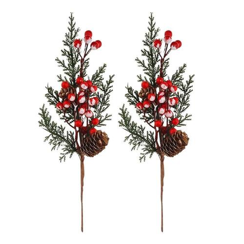 Kit 2 Galhos Pick Natal Folhagens Pinhas e Cereja 30cm