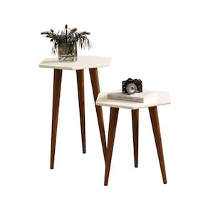 Jogo 2 mesas sala retrô pés palito, lateral e apoio tampo sextavado cor off white - comprar moveis em casa Jogo de 2 mesas lateral e apoio, é vendido pela comprar móveis em casa, oferece um ambiente sofisticado de alta qualidade e acabamento para sua sala. Dimensões do produto montado: Mesa lateral: Altura: 47 cm Largura: 43 cm Profundidade diagonal: 49 cm Mesa apoio: Altura: 62 cm Largura: 43 cm Profundidade diagonal: 49 cm Observações: - estilo retro - tampo sextavado - produzida em mdf de 15mm; - pé de madeira maciça Pintura: Produto com pintura ultravioleta, maior resistência e durabilidade, além de proporcionar um acabamento perfeito para o produto. Instruções de uso e manutenção: Limpar apenas com pano levemente umedecido com água Montagem: Este produto acompanha manual de instrução detalhando passo a passo de como montar. A montagem do produto é de fácil entendimento, mas não deixamos de ressaltar que a mesma deverá ser feita por um profissional, para que não ocorram danos no produto. Atenção: a montagem não é oferecida pela comprar moveis em casa, a montagem do produto é por conta do comprador. Fotos meramente ilustrativas não acompanham os produtos de decoração. Observações importantes: O produto é lacrado e novo com embalagem . A é de 60 dias por defeitos de fabricação. Em caso de erro de montagem, uso inadequado do produto, ou outros acidentes do gênero esta não será acionada. Se por eventuais circunstâncias o produto apresentar defeitos de fabricação, o cliente deverá imediatamente entrar em contanto conosco com o manual de montagens em mãos e com o numero da peça que venha estar que sofreu danos. A comprar moveis em casa ira imediatamente providenciar uma nova peça o mais rápido possível. Se no ato de recebimento do produto o cliente verificar que o produto não está em prefeito estado, principalmente por ocasião de transporte irregular, o cliente deverá recusar o recebimento do produto e entrar em contato para resolver o problema. Todo produto estará acompanhado de um manual de instrução para a montagem do produto. As imagens são meramente ilustrativas Os produtos não são acompanhados de produtos de decoração vasos, revistas, etc. .