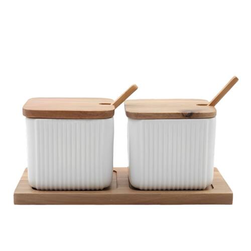 Itens da embalagem: 1 suporte em bambu 2 potes em cerâmica 2 colheres em bambu