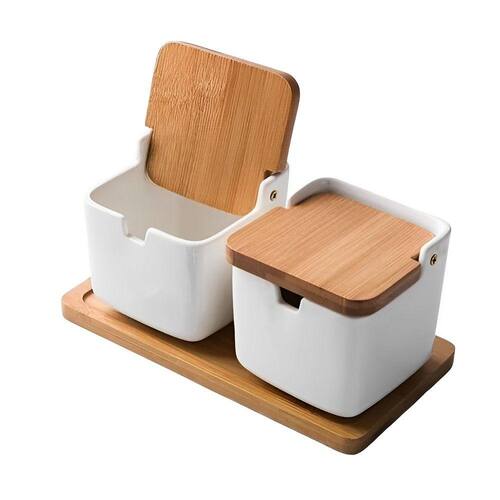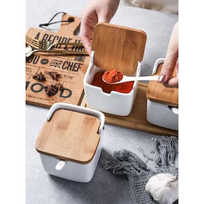 Jogo 2 Porta Condimento em Porcelana Com Tampa De Bambu