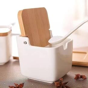Nosso Jogo de 2 Porta Condimento, possui base apoio em bambu, pote e colher em cerâmica branca que acompanham a tampa também em bambu.