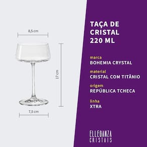 Jogo com 2 taças de cristal para cocktail 220 ml linha xtra bohemia Jogo com 2 taças de cristal para cocktail com 220 ml da linha xtra bohemia crystal Resistência titânio e cristal ecológico Detalhes do produto Material: cristal com titânio, mais resistente que o cristal comum Origem: produto da república tcheca Produto: taças de cristal Quantidade: 02 taças Capacidade: 220 ml cada taça Tamanho: 17 cm de altura, 8,5 cm de diâmetro de bocal e 7,5 cm de diâmetro de base Marca: bohemia crystalex Linha: xtra Embalagem: os produtos são cuidadosamente envolvidos por plástico bolha e inseridos em uma caixa reforçada para assegurar a integridade do produto no transporte. Substituímos produtos danificados no transporte. Postamos nossos produtos nos correios de 01 a 02 após a compra. Todos os nossos produtos acompanham a impressa. Trocas e devoluções Seguimos todas as normas vigentes no código de defesa do consumidor. Adicionalmente, trocamos produtos danificados no transporte. Informações relevantes 1. Já imaginou beber ou servir suas bebidas em taças ou copos de cristal com classe e sofisticação A elleganza cristais comercializa produtos com preços excepcionalmente abaixo do mercado, de qualidade assegurada pela marca tcheca bohemia crystal. Após anos de pesquisa e desenvolvimento, distribui em mais de 100 países cristal de espessura bem fina, livre de Cinza, com design e transparência incríveis. 2. Mas cristal não quebra facilmente Não. O cristal com titânio é muito mais resistente a impactos e mudanças de temperatura se comparado ao cristal comum, proporcionando maior segurança e comodidade no manuseio. A elleganza cristais trabalha apenas com produtos contendo titânio em sua composição, trazendo excelência e qualidade a preços imbatíveis. Sobre a bohemia crystal A bohemia crystal é líder global no mercado de cristais, com atuação em mais de 100 países. Fabrica seus produtos na república tcheca e realiza altos investimentos no desenvolvimento e melhoramento de seus produtos para garantir-lhes qualidade de ponta e ser referência global de qualidade e sofisticação. Eles foram os precursores do movimento que tornou o cristal um material ecológico, sem Cinza em sua composição. Também se destacam de outras marcas ao adicionar titânio para seus produtos mais especiais e assegurar resistência muito superior ao cristal comum. A marca oferece aos seus clientes uma vasta gama de produtos, desde utensílios domésticos a itens para indústria química. Cada linha de produto tem sua embalagem personalizada de acordo com suas características e tamanho. Marca: Não Informado