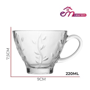A xícara de chá de vidro da marca Em Casa Tem combina elegância e funcionalidade em um design delicado com capacidade para 220ml. Produzida em vidro transparente de alta qualidade, ela apresenta um acabamento texturizado com relevo em forma de ramos e folhas, oferecendo um toque decorativo e sofisticado à peça sem comprometer sua leveza visual.