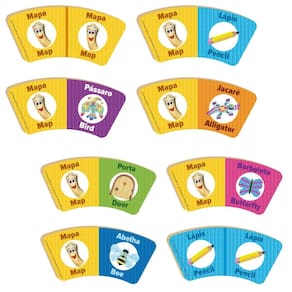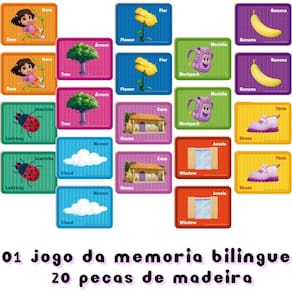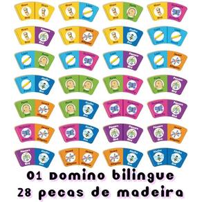 Conteúdo da Embalagem: 01 jogo de memoria Bilíngue com 20 peças e 01 jogo de domino bilíngue com 28 peças