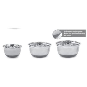 Jogo 3 Bowl'S 'Inox Silicone Descrição: Para você que gosta de uma mesa bem posta e com itens de qualidade para servir sua família e amigos em excelentes e sofisticadas refeições, o Bowl de Inox com Base em Silicone. Mimo Style é ideal. A peça é feita em aço inox resistente, com design diferenciado. Uma boa pedida inclusive na hora de presentear. A tigela se adapta as mais diversas necessidades na cozinha já que seu material retém a temperatura ao qual é exposta. Assim ela garante uma perfeita conservação de alimentos quentes, como também um congelamento incrível na geladeira ou freezer. Para ampliar sua praticidade, a peça pode ser levada a lava-louças. É a qualidade e a versatilidade dos produtos diretamente para sua casa. Contém: 3 bowls 17cm/ 21cm/ 25cm circunferência Marca: Não Informado Ean: 7908216101302