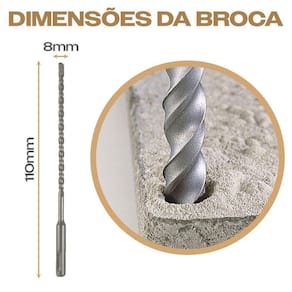 Kit com 3 Brocas SDS Plus 8mm x 110 mm Metal Duro para Martelete Eda Profissional - Marca: Eda Profissional - Kit com 3 Brocas - Diâmetro: 8mm - Comprimento: 110mm - Encaixe: SDS Plus - Ponta de metal duro com tungstênio vídea - Corpo em aço carbono temperado - Ideal para perfuração em concreto, granito, azulejo, rocha, alvenaria, rochas e pisos - Compatível com martelos rotativos que possuam encaixe SDS plus - Dureza 49 a 51 HRc que proporciona mais resistência em menos desgaste em sua haste helicoidal - Garantia: 90 dias contra defeitos de fabricação